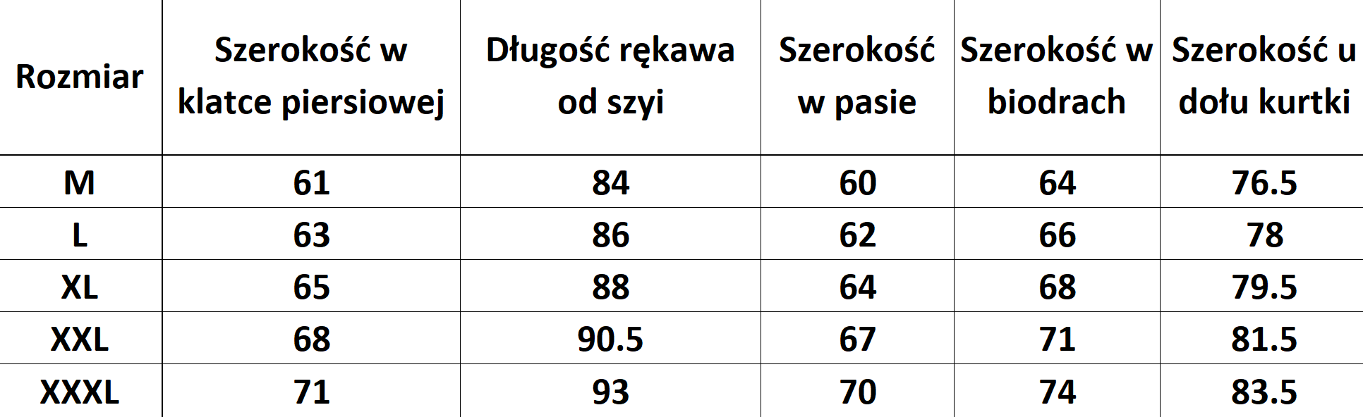 - Rozmiary: M, L, XL, XXL, XXXL