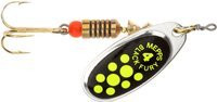 Produkowana jest w rozmiarach od #00 do #4 i w czterech kolorach paletki: czarnym, miedzianym, srebrnym i złotym. Jej najbardziej transparentną cechą jest czarna naklejka na zewnętrznej powierzchni paletki z nadrukiem kolorowych kropek w kolorach żółtym, fluoseledynowym i pomarańczowym. Firma Mepps oferuje także błystkę o czarnym kolorze paletki z nadrukiem kropek w dwóch kolorach fluoseledynowym i zielonym. Kropki te podczas wirowania tworzą kolorowe smugi mające za zadanie imitować korpus owada. Błystki Black Fury są szczególnie skuteczne podczas intensywnej rójki owadów (chruścików, widelnic i dużych jętek).
